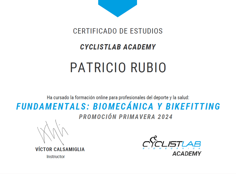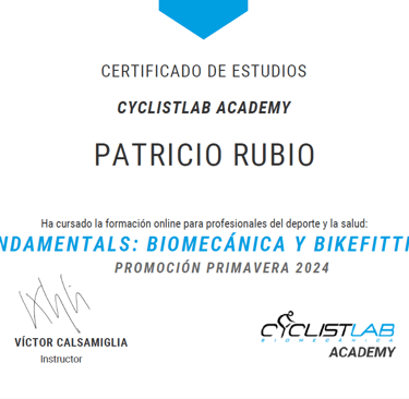Mi interés por la biomecánica y el bike fitting nace a partir de sentir molestias y dolores en mi práctica del ciclismo; lo que me llevó a realizar estudios con la prestigiosa Cyclist Lab Academy de Victor Calsamiglia, los cuales los curse con éxito y los he ido poniendo en práctica con muchos análisis biomecánicos a ciclistas que presentan alguna molestia, dolor o simplemente quieren mejorar su desempeño con una correcta posición.